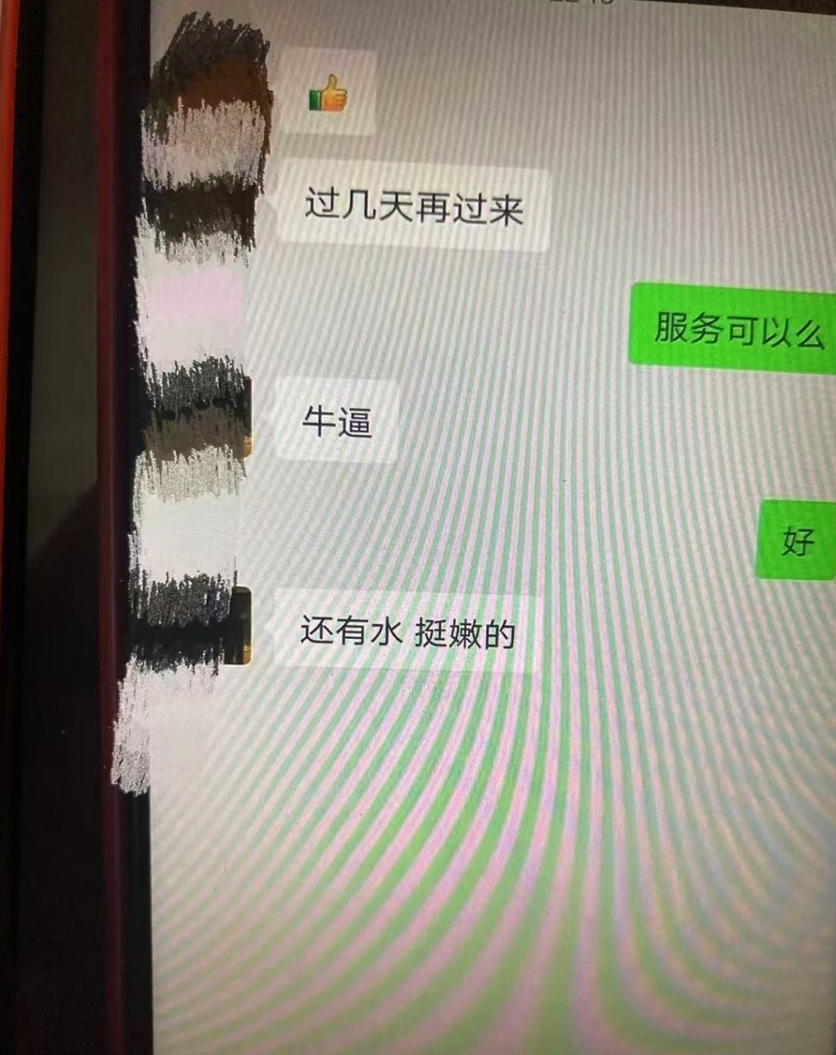 是200的价格,谈谈加一张做了点别的,嘿嘿,去过的才能加微信,看见月月反馈不错,就约了一下还行,水挺多,下边也还挺紧,有感觉,期待下一批更新的人员。